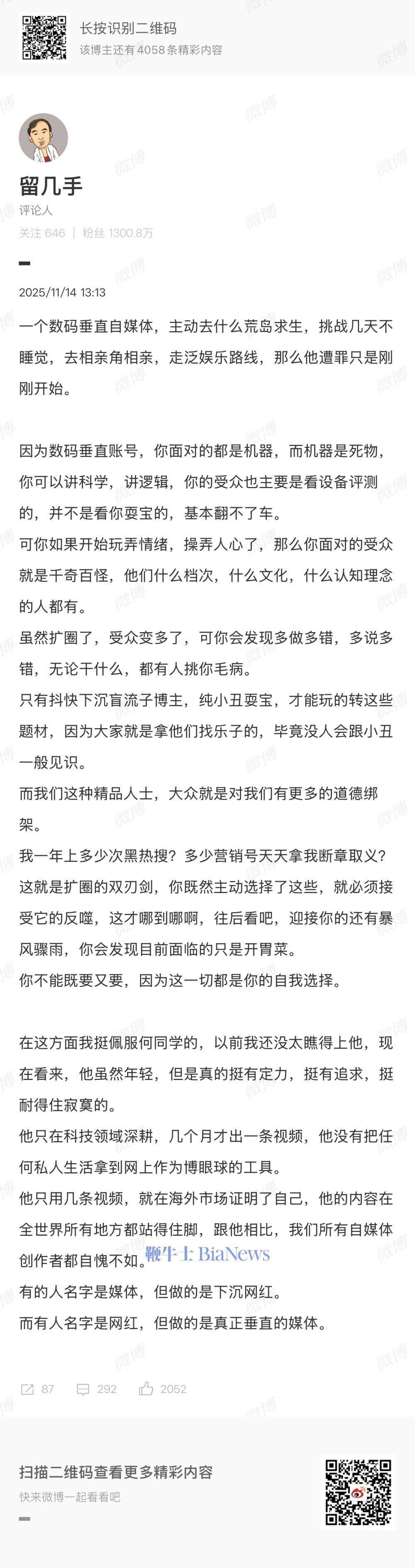 11月15日消息,网红留几手昨天在微博点评影视飓风创始人Tim,称一个数码垂直自媒体,搞荒野求生,去相亲,走泛娱乐路线,玩弄情绪,操弄人心,遭罪只是刚刚开始。